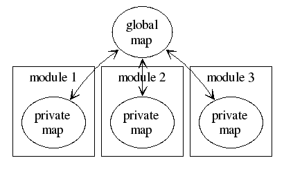 the private memory map. Points to which the module calling plc_update() has right access are copied from the private to the global map. Read-only points will copied from the global map to the private map. The updates are semaphore controlled. This provides for atomic